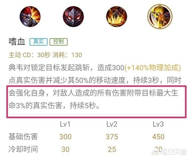只要理解典韦大招这个问题就简单了。大招【嗜血】:五秒内对敌人造成的所有伤害附带目标最大生命3%的真实伤害。这个所有伤害就包括典韦自身技能伤害和装备伤害。装备伤害就指反甲反伤和火甲的烫伤,都能变为真实伤害,也就是反真伤,汤真伤,而且每反弹一次伤害都会附带敌人最大生命3%的真实伤害,虽然不多,但是只要典韦开启大招,这些伤害就会无限触发,积少成多,而且都是真实伤害,是非常恐怖的,反甲即使典韦防御装,又是典韦攻击装,能够让典韦又硬又刚,伤害爆炸,防御爆炸。